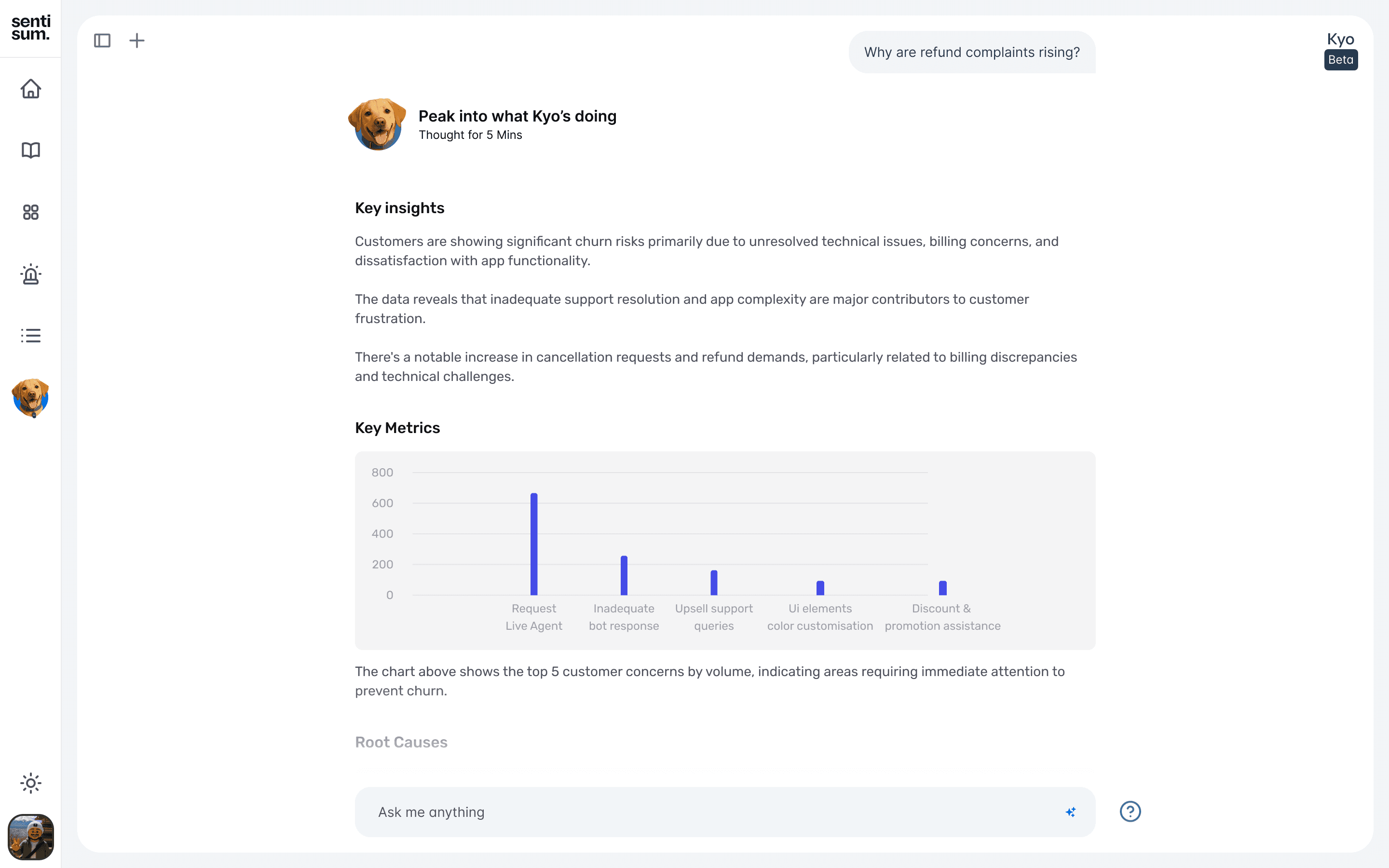 Because Kyo analyzes millions of conversations, generating an answer can take 5–8 minutes.