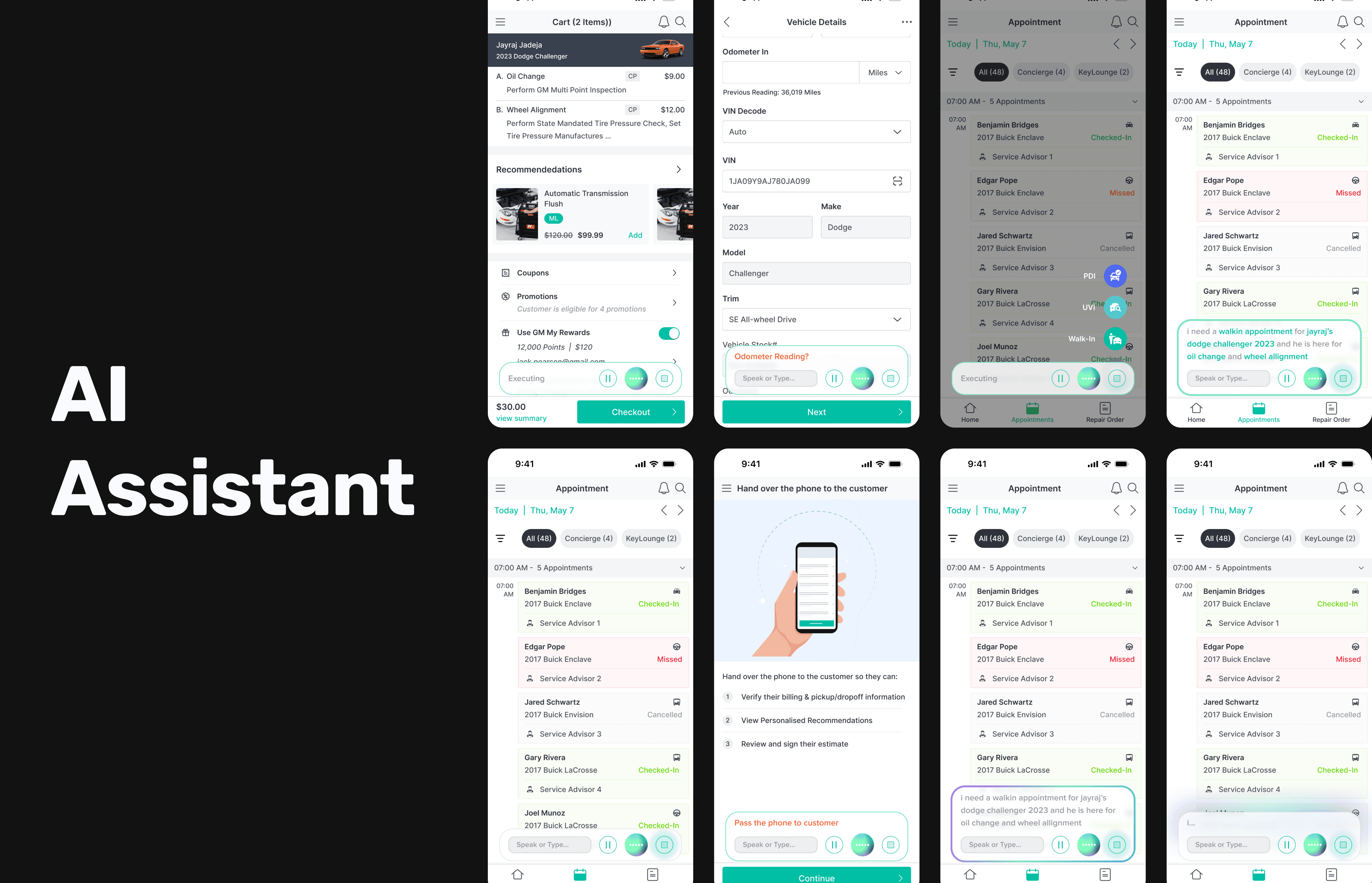 Originally built during a hackathon, this concept evolved into a production-ready AI voice assistant for automotive technicians. It enabled hands-free control of repair orders through natural commands like “Clock in for RO 3471,” cutting manual input errors by 50% and saving time in high-noise, high-pressure service environments.